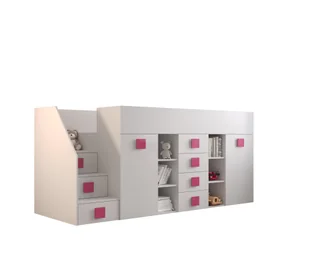 93 cm - Biurko (szer. 88 / wys. 76 / gł. 45,5 cm / przestrzeń na nogi 50 cm) Cechy - Korpus i fronty wykonane z matowej płyty wiórowej laminowanej 16 mm - Krawędzie starannie wykończone 0,5 mm okleiną PVC - jednostki są połączone za pomocą złączy mimośrodowych - Uchwyty wykonane z lakierowanej płyty MDF - Szuflady komody poruszają się na aluminiowych prowadnicach - maksymalna wysokość materaca 16 cm - Wybierz stronę łóżka podczas składania zamówienia Kolory - biały + błyszczące różowe uchwyty Powierzchnia spania: