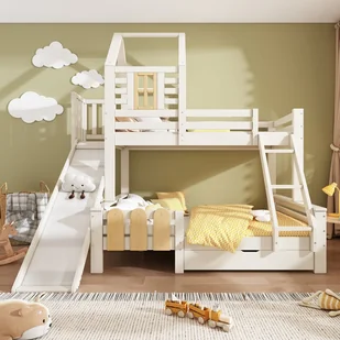 Kształt chatki z bali, dekoracyjne ogrodzenie i zjeżdżalnia prowadząca bezpośrednio na dolny poziom tworzą bajkową atmosferę. Ponadto dolny poziom posiada dużą szufladę na kółkach, idealną do przechowywania zabawek, książek lub ubrań.