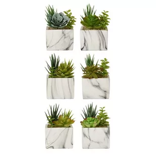 Komplet roślin sztucznych składających się z 6 szt. Rośliny wykonane z wysokiej jakości tworzywa umieszczone w eleganckich biało szarych, betonowych donicach imitujących marmur. W skład kompletu wchodzą rośliny egzotyczne, trawy oraz sukulenty. Piękna dekoracja do wnętrz, jak również na balkon, taras.