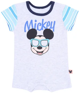 Szare body na krótki rękaw oraz krótkie nogawki. Z przodu z wizerunkiem Myszki Mickey. W kroku oraz na ramieniu zapinane na nieuczulające, bezniklowe zatrzas...