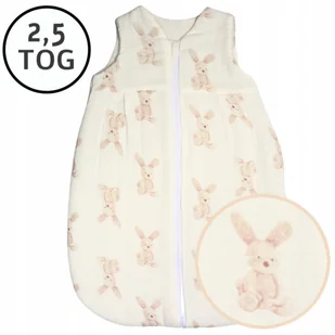 ŚPIWOREK NIEMOWLĘCY Z MUŚLINU Wzór: Bunny Rozmiar: 68-74 (całoroczny) około 2,5 TOG ciepły i miły w dotyku zapinany na bezpieczny zamek błyskawiczny 100% baw...