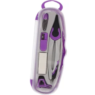 Szkolny cyrkiel metalowy w zestawie z wymiennymi wkładami grafitowymi, temperówką do grafitów, gumką do mazania oraz z uchwytem do ołówka. Transparentne plastikowe etui. Dostępny w 4 kolorach. <br>