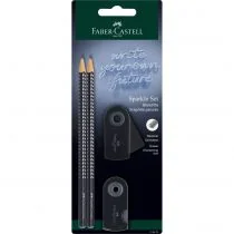 Zestaw ołówków grafitowych Sparkle Faber-Castell 2 szt. w kolorze czarnym z gumką Sleeve Mini i temperówką Sleeve Mini. Unikalny design z atrakcyjnymi błyszczącymi kropkami został zaprojektowany tak, aby dodać blasku biurkowej codzienności. Ołówki posiadają brokatową końcówkę. Ergonomiczny trójkątny.