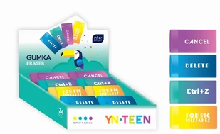 Kolorowa gumka o poręcznym, owalnym kształcie i młodzieżowych hasłach na owijce. Doskonale ściera, nie pozostawiając smug. Wygodna do przechowywania w każdym piórniku. Dostępna w 4 kolorach: fioletowym, niebieskim, turkusowym i żółtym.