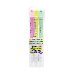 - Zakreślacze które można wymazywać! - Pomagają w organizacji dokumentów, zeszytu i map. - Płynne zakreślanie i usuwanie, nie pozostawiające żadnego śladu. - Zestaw 3 kolorów: różowy, żółty, zielony