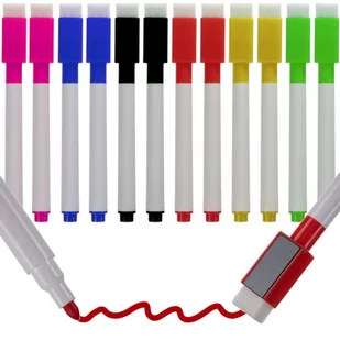 FLAMASTRY SUCHOŚCIERALNE 12szt / 6 KOLORÓW Flamastry, które doskonale sprawdzą się jako markery do tablicy magnetycznej. Niewątpliwą zaletą takiego rozwiązania jest fakt, że zapisane na tablicy notatki w łatwy sposób możemy usunąć za pomocą suchej ściereczki lub gąbki, która jest w zatyczce. 6 KOLORÓW – w zestawie jest 12 mazaków w 6 kolorach takich jak: niebieski, żółty, czerwony, czarny, różowy i zielony, każdego koloru jest po 2 sztuki. GĄBKA DO ŚCIERANIA + MAGNES – na końcu zatyczki znajduję się gąbeczka, dzięki której możesz ścierać na sucho pisaki z tablicy.