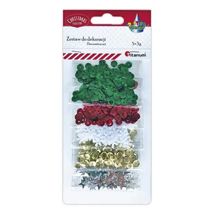 Zestaw cekinów, 5 wzorów i kolorów po 3 g, okrągłe o średnicy 7 mm w kolorach zielonym, czerwonym, złotym, płatki śniegu o średnicy 11 mm w kolorze białym, gwiazdki o średnicy 10 mm w kolorze srebrnym.