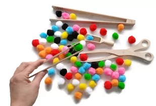 Zestaw do ćwiczenia motoryki małej: Drewniane przybory + komplet kolorowych pomponów. W skład zestawu wchodzą: Pompony 80 sztuk (po 10 szt każdego koloru: żółty, pomarańczowy, czerwony, niebieski, zielony, biały, czarny, różowy), szczypce drewniane 30 cm, szczypce drewniane 22 cm, nabierak drewniany 11 cm, nożyce drewniane 27 cm. Jaki korzyści niesie nauka i zabawa z naszym zestawem? Pozytywnie wpływa na koncentrację, usprawnia motorykę małą, wspiera koordynację wzrokowo-ruchową, uczy precyzyjnej pracy palców i dłoni naszego dziecka, trenuje cierpliwość.