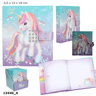 Pamiętnik na kod Ylvi z dźwiękiem i światłem 13440ADEPESCHE ➡️ Art. pap. \Pamiętniki, notesiki ✔️ Pamiętnik na kod Jednorożec Ylvi na najskrytsze zapiski, po otwarciu przez chwilę słychać magiczną melodię i podświetla się kilka elementów na okładce. W środku polska instrukcja, wymienne baterie. Wymiary pamiętnika to 3x15x20,5cm. Kartki w środku: