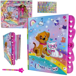 Pamiętnik sekretny na hasło jest idealnym miejscem dla dzieci, które chcą zapisywać swoje sekrety i najgłębsze myśli w bezpiecznym i prywatnym miejscu. Okładka pamiętnika przedstawia uroczego pieska i kotka, co sprawia, że jest niezwykle atrakcyjna dla młodych użytkowników. W zestawie znajduje się również arkusz z naklejkami oraz samoprzylepne, kolorowe diamenciki służące do ozdabiania stron pamiętnika, a także magiczny długopis ze światłem, który dodatkowo angażuje dziecięcą wyobraźnię. Dzięki temu pamiętnikowi dzieci mogą wyrazić swoją kreatywność, tworzyć osobiste notatki i odkrywać ukryte wiadomości, co rozwija ich wyobraźnię i umiejętności twórcze. Całość jest zaprojektowana tak, aby zapewnić dzieciom godziny pełne radości i kreatywności.