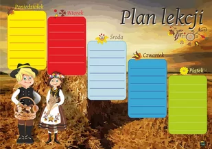 Plan lekcji dla dzieci - wzór borowiacki Niezbędnik każdego pilnego ucznia - pełen barw plan lekcji z motywem pary ubranej w stroje ludowe z wzorami szkoły b...