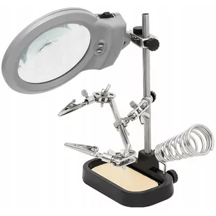 Zestaw narzędzi ułatwiający lutowanie oraz inne precyzyjne czynności instalatorskie i elektroniczne. W podstawie znajduje się gąbka do czyszczenia grotu oraz solidny uchwyt na lutownice. Do wykorzystanie są także dwa uchwyty "krokodylki" oraz szeroka lupa z możliwością podświetlenia. Duże możliwości konstrukcyjne umożliwiają dostosowanie ustawień do własnych potrzeb. Idealnie sprawdzi się rwnież podczas takich pracy jak klejenie lub modelarstwo, wszędzie tam gdzie potrzebna jest precyzja i dokładność.