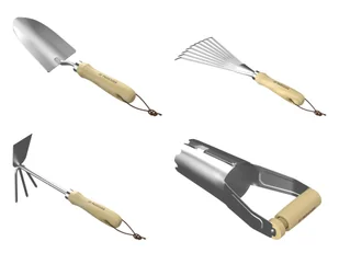 stal nierdzewna, drewno, skóra Sadzarka, automatyczna sadzarka: stal nierdzewna, drewno Wymiary Łopatka do kwiatów: ok. 330 × 84 × 40 mm Szpadel: ok. 330 × 78 × 40 mm Widły do kwiatów: ok. 296 × 80 × 40 mm Mini-grabki: