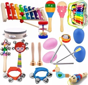 W praktycznym plecaczku znajdują się m.in. cymbałki, tamburyn / bębenek, trójkąt, kastaniety, grzechotki, gwizdki oraz dzwoneczki. Ten wyjątkowy zestaw z pewnością skradnie serce niejednego malucha. Wykonane zostały z drewna i pomalowane na żywe kolory, które z pewnością przypadną dziecku do gustu. Posiadają uniwersalny rozmiar, dzięki czemu nadadzą się zarówno dla przedszkolaka jak i dziecka w podstawówce. Będą doskonałym wyposażeniem na rytmikę czy muzykę i z pewnością pomogą maluchowi w poznawaniu dźwięków i rytmu.