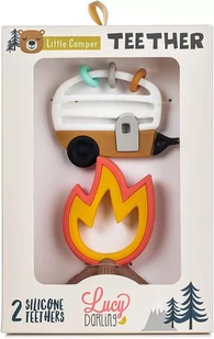 Dwa gryzaki: ognisko i przyczepa kempingowa. Starannie wykonany z miękkiego silikonu. Posiada ruchome części i różną fakturę. Spełnia funkcje gryzaka, smoczka i zabawki.