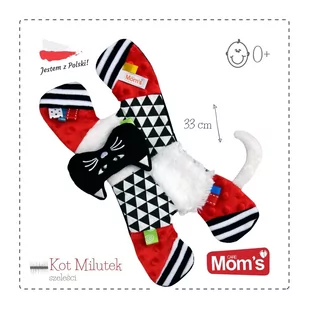 Kot Milutek wypełniony jest szeleszczącą folią, której delikatny dźwięk przykuwa uwagę najmłodszych, dostarczając bodźców słuchowych. Delikatny szelest uspokaja maluszka, ponieważ kojarzy mu się z dźwiękami, które słyszał będąc w brzuszku mamy. Ogonek, miękka, odstająca główka kotka i kolorowe metki zachęcają dzieci do chwytania, wspomagają rozwój motoryki małej i koordynacji ręka-oko. Czerwone wstawki uszyte są z ulubionego materiału dzieci, miękkiej i przyjemnej tkaniny Minky. Szeleścik jest lekki i łatwo się go trzyma dlatego może towarzyszyć dziecku już od pierwszych chwil, zarówno w łóżeczku, jak i na spacerze.