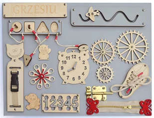 but ze sznurówką sorter cyfry sorter kształty kręcące się zębatki zegar do nauki godzin zasuwka drewniany spinner podstawa z karabińczykiem suwak elementy ozdobne labirynt do prowadzenia figurki imię dziecka WYMIARY: długość: 40 cm szerokość: 30 cm głębokość: 4 cm Podstawa wykonana ze sklejki liściastej 10 mm, malowana farbami dedykowanymi do kontaktu z dziećmi. Elementy zastosowane w naszej tablicy wykonane są z należytą starannością i dbałością o estetykę i bezpieczeństwo dzieci.