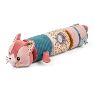 Wałek dźwiękowy z kolekcji Kotka Jeanne belgijskiej marki Lilliputiens to niebanalne, miękkie i wielofunkcyjne źródło rozrywki i nauki. Wałek składa się z 4 poręcznych elementów, z których każdy uszyty jest z materiałów o różnych wzorach i fakturach oraz posiada ukryte funkcje. W głowie kotki znajduje się grzechotka, inna część szeleści, kolejna posiada okienko z kolorowymi, grzechoczącymi kuleczkami i miękkim lusterkiem, a ostatnia ma ukryty wewnątrz dzwoneczek. Kotka posiada dodatkowo stymulujące sensorycznie wąsiki i uszka oraz ogon w kształcie miękkiego uchwytu. Elementy można łączyć ze sobą dzięki rzepom.