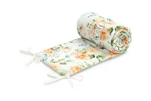Ochraniacz do łóżeczka pasuje do każdego standardowego łóżeczka dziecięcego. Wyróżnia się pięknymi materiałami i wszytą falbanką, które sprawią, że pokoik maluszka zyska wyjątkowy urok. Ochraniacz wykonany jest z miękkiej bawełny z nadrukiem. Wypełnienie z owaty ochroni dziecko przed urazami podczas poruszania się po łóżeczku. Utrzymanie ochraniacza we właściwej pozycji zapewnia gęste wszycie tasiemek służących do przywiązania go do szczebelków łóżeczka.
