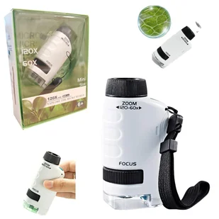 LED: Mini mikroskop posiada zintegrowane źródło światła LED, które emituje miękkie, przyjazne dla oczu światło. Oświetlenie LED jest regulowane. ROZWÓJ: Wyposażony w wysokiej jakości optykę, która oferuje poziomy powiększenia od 60x do 120x i uwidacznia skomplikowane struktury i tekstury. KONSTRUKCJA: