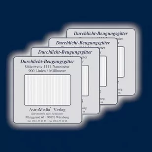 Rozczepione przez siatkę dyfrakcyjną światło, podobnie jak po przejściu przez pryzmat, ulega rozszczepieniu. Idealna do samodzielnej budowy spektroskopu i innych eksperymentów z światłem. Opis: Przezroczysta folia z naniesioną siatką dyfrakcyjną 1000 linii na mm. Przy zakupie siatki o wymiarach 150x38 mm (art. nr 407.NDI) do siatki dodawane są ramki do jej osadzenia. Art. Nr 407. NDI : rozmiar siatki 150x38 mm plus 4 ramki do osadzenia siatki Art.
