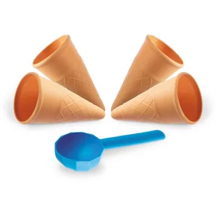 Foremki do piasku Generic Wymiar produktu: 15 cm W zestawie: 4 rożki i łyżka do nakładania Pakowanie: 24 szt. Re-New Toys – wyprodukowano z materiałów z recyklingu