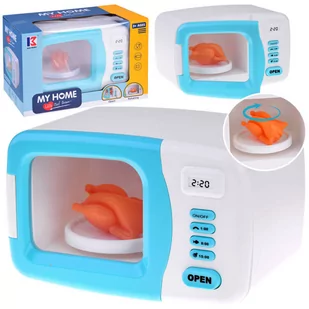 Kuchenka mikrofalowa to niezbędny sprzęt w każdej kuchni małej gospodyni. Dzieci lubią gotować swoim misiom i lalkom przeróżne jedzonka, dlatego ta kuchenka mikrofalowa zapewne zachwyci każdego małego kucharza. Mikrofalówka posiada włącznik on/of, który po przyciśnięciu uruchamia sprzęt do podgrzewania jedzenia. W mikrofali znajduje się kurczak, który podczas uruchomienia kuchenki kręci się na obrotowym talerzu. Środek kuchenki podczas funkcji włączenia zostaje podświetlony czerwonym światełkiem.