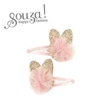 Komplet dwóch spinek do włosów z brokatowymi kotkami Suzan holenderskiej marki Souza! Na każdej z nich znajduje się złota aplikacja w kształcie kotków, ozdobiona dodatkowo tilowym różowym pomponem. Zaciski na klik sprawiają, że ozdoby stabilnie trzymają się włosów. Mają one różowy metaliczny. . .