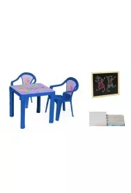 Zestaw: stolik i dwa krzesła, tablica do pisania. Kolor zestawu Niebieski, wtopiona etykieta IML z kolorowym motywem w blat stolika i oparcie krzesła uniemożliwa jego odklejenie i gwarantuje wysoką odporność na warunki atmosferyczne, do stosowania zarówno na zewnątrz, jak i wewnątrz. Tablica kredowa z wyposażeniem (kreda biała + gąbka) o wymi. 35,5 x 28 cm.