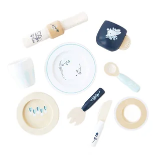 Obiad smakuje lepiej, gdy jest podany na ładnych naczyniach. Ta zabawka jest trwała i będzie służyć przez naprawdę długi czas. Naturalny kolor drewna, biel i odcienie niebieskiego ładnie ze sobą współgrają, a do tego dochodzą ilustracje roślin. W zestawie znajdziesz kubek, spodek, filiżankę, 2 talerze, nóż, widelec, łyżkę i serwetkę z ozdobnym pierścieniem. Dzieci będą ćwiczyć umiejętności motoryczne, zręczność i koordynację ręka-oko podczas zabawy z wyobraźnią.
