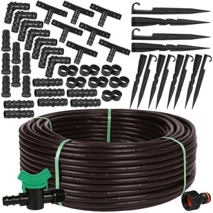 - 1 x Przyłącze kranowe 1/2" - 1 x zawór 1/2" z przyłączem liniowym 16 mm - 20 kotew o długości 16 mm 18 cm - 3 x złącza 16 mm - 3 trójniki 16 mm - 3 kolanka 16 mm - 3 wtyczki 16 mm - 3 złącza (oczkowe) (2x 16 mm) 100m :