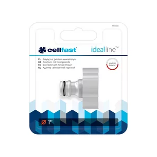Przyłącze z gwintem wewnętrznym Ideal Line 25,4 mm (1") Cellfast. Zapewnia szybkie i wygodne rozłączne podłączenie węża do kranu z gwintem zewnętrznym. Stosowane jest w systemach podlewania i nawadniania. Przyłącze należy nakręcić na kran, końcówka węża posiada zamontowane szybkozłącza. Dzięki zatrzaskom szybkozłącza precyzyjne połączenie uzyskiwane jest tylko za pomocą wciśnięcia szybkozłącza na przyłącze kranowe.