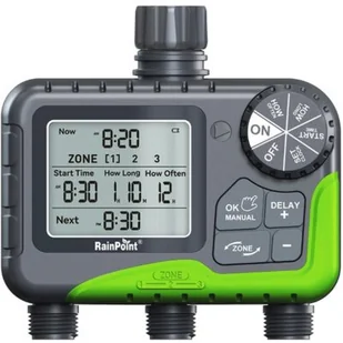 Sterownik nawadniania RainPoint ITV305 to funkcjonalne urządzenie, które pozwala niezależnie zarządzać trzema strefami nawadniania w ogrodzie. Każda strefa może mieć indywidualnie ustawiony czas startu, długość cyklu (od 1 minuty do 4 godzin) oraz częstotliwość pracy, co umożliwia dopasowanie podlewania do różnych rodzajów roślin i powierzchni. Duży wyświetlacz LCD oraz wygodne pokrętło z przełącznikiem stref sprawiają, że konfiguracja i obsługa sterownika są wyjątkowo proste i intuicyjne.
