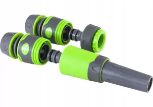 Zestaw złożony z 4 elementów: zraszacz prosty regulowany, szybkozłącze przelotowe 1/2", szybkozłącze ze stopem 1/2" oraz przyłącze do kranu z gwintem wewnętrznym z redukcją 1/2" na 3/4". Wszystkie elementy wykonano z tworzywa sztucznego ABS pokrytego gumą termoplastyczną TPR.