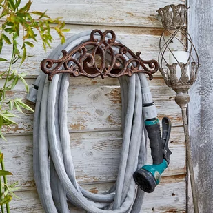 Kunsztownie uformowane żelazo. Nostalgia we francuskim stylu. Dekoracyjny i bardzo przydatny w ogrodzie. Piękny, nostalgiczny uchwyt na wąż ogrodowy bardzo łatwo zamocować na ścianie. Umożliwia jego zwinięcie w bardzo praktyczny i schludny sposób.