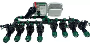Zestaw do nawadniania 8 sekcji Rain Bird z WiFi W zestawie do automatycznego podlewania (8 sekcji) znajdziemy: Sterownik Rain Bird wewnętrzny i zewnętrzny zarazem - 8 sekcji z wbudowanym modułem Wifi -1 sztuka Elektrozawór Rain Bird HV z regulacją 1" - 8 sztuk Filtr antypiaskowy 1" - 1 sztuka Zestaw do odpowietrzana ze złączka do kompresora - 1 sztuka Trójnik Kolektor 1" - 8 sztuk Kolano Kolektor 1" - 1 sztuka Przelot PE 25 x 1" - 10 sztuk Montaż zestawu Rain Bird 8 sekcji Montaż można wykonać według schematu pokazanego na zdjęciu. Nie wymaga on użycia dodatkowych narzędzi np. kluczy hydraulicznych. Należy jednak pamiętać o dwóch istotnych aspektach: