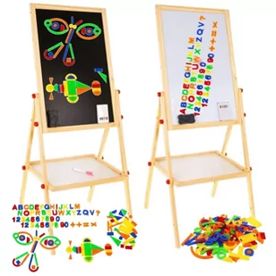 Duża drewniana tablica to zabawka edukacyjna dla dzieci od 3 - go roku życia. Tablica jest z jednej strony biała magnetyczna, a z drugiej czarna kredowa. Biała strona służy do pisania pisakiem znajdującym się w zestawie. Pisak posiada magnez, żeby go można było przyczepić do tablicy oraz gumkę do mazania. Na czarnej stronie można malować kredą znajdującą się w zestawie, a potem wymazać wszystko gąbką. Zabawa z tablicą pozytywnie wpływa na zdolności manualne, koncentrację i wyobraźnię.