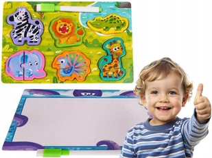 Drewniana dwustronna tablica ze zwierzaczkami dla dzieci od 3-go roku życia. Z jednej strony tablica służy do malowania pisakiem dołączonym do zestawu. Pisak posiada też gumkę, by można było wyczyścić obrazek i malować ponownie. Z drugiej strony tablicy jest rysunek dżungli i wgłębienia na ułożenie zwierzaczków z drewnianych klocków. Wśród zwierzaczków mamy zebrę, lwa, słonia, pawia, żyrafę i krokodyla. Zestaw wykonano z dbałością o szczegóły, w żywych kolorach.