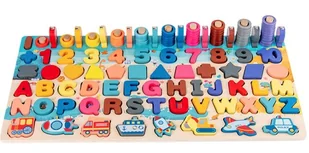 Układanka posiada 55 kolorowych pierścieni, 10 cyfr, 10 drewnianych słupków, znaki: =, +, - . Dzięki tak bogatemu zestawowi, dziecko poprzez zabawę nauczy się podstaw matematyki. Zestaw zawiera również pełny alfabet złożony z 26 drewnianych liter, który ułatwi poznawanie pierwszych słów.