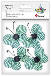 Dekoracje samoprzylepne papierowe wzór: motyle, czułki z drucika wymiar: 65 x 45 mm kolor: biało-zielona kratka Idealne do dekoracji, zdobienia prezentów i wielu innych prac plastycznych Produkt doskonały dla hobbystów, profesjonalistów i amatorów rękodzieła