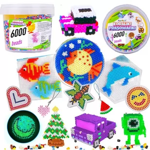 czerwonym, różowym, niebieskim, białym, czarnym, brązowym, zielonym, żółtym, fioletowym i pomarańczowym. Dodatkowo załączone formy w kształcie koła, serduszka, kwadratu gwiazdki i sześciokąta sprawi, iż dziecko będzie mogło tworzyć obrazki o różnych kształtach w bajecznych kolorach. Całość znajduje się w estetycznym wiadereczku z uchwytem, ułatwiają przechowywanie zestawu i utrzymanie porządku. Zestaw zawiera: 6000 koralików w 10 różnych kolorach (średnica koralika ø5) pinceta do układania koralików, 5 podkładek w różnych kształtach, 10 szablonów, 5 papierków do zaprasowywania, wiadereczko z uchwytem do przechowywania.