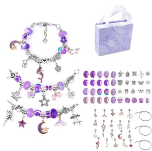 Kreatywny zestaw dziecięcy do robienia biżuterii koraliki charms fioletowy Cechy produktu: Piękny zestaw koralików, zawieszek i charmsów, który pozwoli dziewczętom samodzielnie zaprojektować swoją biżuterie. Nowa bransoletka, naszyjnik czy wisiorek ? Nic prostszego. Z tym zestawem codziennie stworzysz coś innego, wyjątkowego, by zawsze zachwycać i olśniewać. Zabawa nigdy się nie kończy, gdyż każdy z elementów w prosty sposób można zakładać lub zdejmować z łańcuszka.