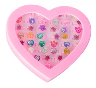 Piękne kolorowe pierścionki sprawią radość każdej dziewczynce. 36 pierścionków z błyszczącymi elementami umieszczono w pudełeczku w kształcie serca. Są wykonane z plastiku, pasują na mały palec dziecka (wewnętrzna średnica 1,3 cm