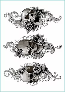 Duże tatuaże zmywalne ze wzorem czaszek i kwiatów. Umożliwiają tymczasową aplikację pięknej grafiki w dowolnym miejscu na ciele - ramieniu, nadgarstku czy kostce. Przed aplikacją tymczasowego tatuażu wykonaj próbę alergiczną na niewielkim fragmencie ciała. Zapoznaj się również z instrukcją, jak odpowiednio nałożyć tatuaż zmywalny.