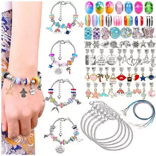 Wszystkie elementy można nawlekać na jedną z pięciu bransoletek lub pięciu rzemyków, które posiadają regulację długości. Różnorodność wzorów oraz kolorów pozwoli małej artystce na prawdziwą burzę mózgów! Łatwe tworzenie biżuterii Samodzielne wykonywanie biżuterii to ciekawy pomysł na doskonalenie zdolności manualnych. Wystarczy wybrać ulubione koraliki lub zawieszki i nawlec na bransoletkę lub naszyjnik!