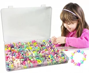 Duży zestaw do tworzenia biżuterii. Zawiera kolorowe koraliki w różnych wielkościach oraz liczne zawieszki w kształcie kwiatków, motylków, serduszek i wiele innych. Do tego wszystkiego dołączona jest specjalna cienka żyłka, na którą nawlekamy koraliki. Zestaw gwarantuje mnóstwo długiej i ciekawej zabawy na długie godziny.