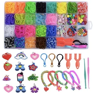 Zestaw do robienia bransoletek duży kreatywny gumki koraliki na prezent Cechy produktu: DIY Rubber Bands to kreatywny zestaw do tworzenia własnych kolorowych bransoletek, naszyjników, figurek i wiele innych rzeczy. Stworzoną biżuterię można przyozdobić dodatkowo gumowymi zawieszkami, połączyć z barwnymi koralikami lub literkami, tworząc np. imię dziecka na bransoletce. Zestaw zapakowany jest w praktyczny organizer z przegródkami, który można otwierać i zamykać, gdy się go nieużywa.