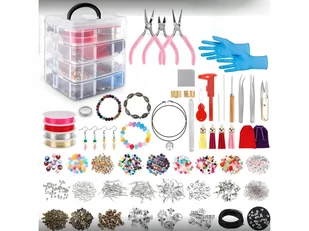 Szczypce, Cążki, Pęsety, Nożyce, Dziurkacz, Igłę, Łańcuszek, Suwmiarkę, Miękką, delikatną szmatkę, Wsporniki na palec, Szpule z żyłkami w różnych kolorach, Drut na szpuli, Czarny powlekany sznurek, Woreczki z tkaniny na ściągacz, 1 parę rękawiczek jednorazowych, Zawieszki - chwosty, Kolorowe koraliki, Zawieszki, Muszelki, Zapinki, Pozostałe akcesoria, Oryginalne opakowanie - 4 poziomowy organizer z przegródkami Specyfikacja: Produkt odpowiedni dla dzieci: powyżej 8 roku życia Ilość elementów: 2062 Wymiary opakowania: ok. 16 x 15,5 x 16,5cm UWAGA! Z uwagi na drobne elementy produkt nie jest przewidziany dla bardzo małych dzieci.