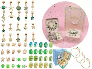 Nie tylko pozwoli zachować ład i porządek wśród wszystkich koralików i bransoletek ale będzie się tez pięknie prezentować na toaletce czy komodzie. Idealny na prezent Zestaw zapakowany jest w piękną szkatułkę oraz torebkę prezentową. To gotowy, pieknie przygotowany pomysł na prezent dla każdej dziewczynki! Zestaw zawiera: 20 dużych, okrągłych koralików w odcieniach zieleni, Różnokształtne koraliki z otworami, Zawieszki, 3 bransoletki, 1 zamykane pudełko na biżuterię, 1 torebkę prezentową. Specyfikacja: