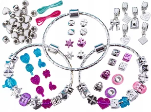 Zestaw zawiera: 3 bransoletki, Mnóstwo charmsów i koralików, 2 rzemyki, Dodatkowe zapięcia, Oryginalne opakowanie. Specyfikacja: Produkt odpowiedni dla dzieci: powyżej 5 roku życia Średnica bransoletki: